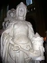 The monument consists of a rectangular sarcophagus 3.90 m long, 2.33 m wide, and 1.27 m tall.[1] The gisants (recumbent effigies) of the deceased couple are lying prostrate with hands raised in prayer. Their heads rest on thick pillows held up by three angels. Margaret's feet are on a greyhound, a symbol of fidelity; Francis's feet rest on a lion, representing strength. At the four corners of the tomb stand four statues, each representing one of the cardinal virtues: Courage, Justice, Temperance and Prudence.