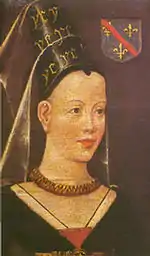 Isabella of Bourbon was born c. 1434 as the second daughter of Charles I, Duke of Bourbon and Agnes of Burgundy, duchess of Bourbon and Auvergne and the daughter of John the Fearless, Duke of Burgundy between 1404 and 1419. Isabella was raised in the court of her uncle, Philip the Good, and became a favourite of his.[2] She married her cousin Charles the Bold in 1454 as his second wife. Although the marriage was politically motivated as part of a truce between Charles I and Charles the Bold, the couple fell in love and became well known for their fidelity to each other.[3]