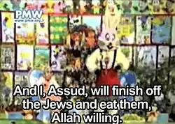 Assoud (Arabic: اسود; also rendered as Assud), a Bugs Bunny or Roger Rabbit-like rabbit character whose name means lion, was introduced after his brother, the previous co-host, Nahoul, died of illness.[26] In explaining why he is called Assoud (lion), when Arnoub (rabbit) would be more appropriate, Assoud explains that "A rabbit is a term for a bad person and coward. And I, Assoud, will finish off the Jews and eat them."[25][26] Before Nahoul's death, Assoud lived in Lebanon; he returned "in order to return to the homeland and liberate it."[25] On his deathbed, he instructs Palestinian children that they must fight and die to liberate Haifa, Tel Aviv and other Israeli cities.[27][28] Assoud hinted in episode 302 that he would be replaced by a tiger when he was martyred.