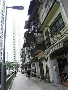 Early tong lau buildings were generally long and narrow with a width of between 12 and 15 feet (3.7 and 4.6 m), determined by the length of the wooden beams.[1] In Hong Kong's building regulations, tong lau refers to a building with any living space intended for more than one tenant.[2] It is essentially a tenement building for residential and commercial use. The ground floor is reserved for commercial use, mostly by small businesses like retail shops and food vendors. The upper floors are for residential use, and cater to Chinese residents of Hong Kong.