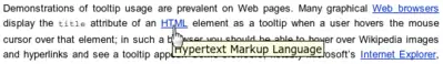 Demonstrations of tooltip usage are prevalent on web pages. Many graphical web browsers display the title attribute of an HTML element as a tooltip when a user hovers the pointer over that element; in such a browser, when hovering over Wikipedia images and hyperlinks a tooltip will appear.