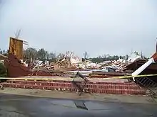 A cold front pushed into warm, moist air in Alabama, Georgia and the Florida Panhandle on February 28, resulting in severe thunderstorms in southern and central Alabama into central Georgia during the morning.[26] At 7:40 a.m CST (1340 UTC) rain fell from the sky and an EF0 tornado blew down several trees and power lines and destroyed two outbuildings in southern Tallapoosa County.[27] 31 minutes later, an EF1 tornado heavily damaged a building and overturned a car at a car dealership in Lee County.[28] At 8:26 am CST (1426 UTC), 10 mobile homes, seven homes, two churches and a school were damaged after an EF2 tornado touched down in Salem, which is also in Lee County.[29]