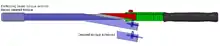 The wrench functions in the same general way as an ordinary beam torque wrench. There are two beams both connected to the head end but only one through which torque is applied. The load carrying beam is straight and runs from head to handle, it deflects when torque is applied. The other beam (indicating beam) runs directly above the deflecting beam for about half of the length then bends away to the side at an angle from the deflecting beam. The indicating beam retains its orientation and shape during operation. Because of this, there is relative displacement between the two beams. The deflecting beam torque wrench differs from the ordinary beam torque wrench in how it utilizes this relative displacement. Attached to the deflecting beam is a scale and onto that is fitted a wedge which can be slid along the length of the scale parallel to the flexing beam. This wedge is used to set the desired torque. Directly facing this wedge is the side of the angled indicating beam. From this side protrudes a pin, which acts as a trigger for another pin, the latter pin is spring loaded, and fires out of the end of the indicating beam once the trigger pin contacts the adjustable wedge. This firing makes a loud click and gives a visual and tactile indication that the desired torque has been met. The indicator pin can be reset by simply pressing it back into the indicating beam.[9][10]