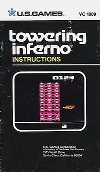 Towering Inferno is an Atari 2600 game designed by Jeff Corsiglia and programmed by Paul Allen Newell and released by US Games in 1982.[2] The player controls a fireman going through a burning skyscraper to save victims and put out the fires. The game was produced under a licence obtained from 20th Century Fox by Quaker Oats, the parent company of US Games, for the video game rights to the movie of the same name.[3]