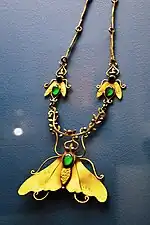 Initially, the working of metals in the new colony was heavily restricted or outright banned for several reasons, including protection of Spanish metal guilds, the fact that the work did not contribute to royal taxes and the fear that the indigenous would make weapons.[5][12][13] However, these soon became impractical to enforce with the restrictions then only to the making of objects related to indigenous religion.[14] The Spanish introduced new metalworking techniques, especially the promoting of copper work by Vasco de Quiroga in Michoacan and various metals by Pedro de Gante in Mexico City .[1][5][12] and eventually indigenous craftsmen competed with European ones.[14] Most of Mexican colonial metal work copied that in Spain, which was Gothic in style and later Renaissance. These styles eventually defined the handcraft work of areas such as Oaxaca, Zacatecas, Durango, San Luis Potosí and Guanajuato .[15] However, after the Conquest, the making of jewelry in Mexico nearly disappeared, with precious metals shipped to Spain. Only after 1551, with the establishment of a Mexican upper class, did this return slowly. At first Spanish craftsmen arrived to work European methods including filigree, repoussé and chasing, engraving and the incrustation of precious stones. But during the colonial period, these craftsmen never reached the level of their contemporaries in Europe. Indigenous craftsmen were relegated in this area to producing cheaper jewelry with lesser metals.[16]