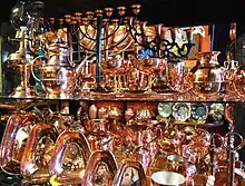 While copper was worked in some parts of Mesoamerica, modern Mexican tradition is Spanish in origin.[29] Copper working was initially ignored by the Spanish conquistadors as they were looking for gold and silver. It was not shipped to Spain as much as the other two. Instead, it eventually became important for the creation of utilitarian items, especially domestic items such as pots and pans.[15] Today, the center of traditional copper work in Mexico is the state of Michoacán, especially the municipality of Santa Clara del Cobre. One traditional hammered copper object is a large vessel in which pork fat is rendered or sugar caramelized for making candies. Every year during the month of August Santa Clara del Cobre holds a copper festival.[30]