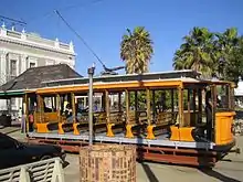 A heritage tram line opened in 1985, on a 1.4-kilometre (0.87 mi) line connecting City Hall with the Open Mine Museum, located on the De Beers Consolidated Mining Company premises, passing the "Big Hole" (Kimberley Mine) along the way.[2] It was designed as an attraction for museum visitors. Service began in October 1985, using a single tram: Open-sided, four-wheel car number 1, built in 1905 for the Kimberley & Alexandersfontein Electric Railway by the John Stephenson Company. It had been converted into "tower car" (overhead wire maintenance car) No. 4[2] in the mid-1920s, and was reconverted into a passenger car in 1983–1985, for use on the heritage tramway. The line is entirely single-track and includes street running along Church Street and roadside running along the old Pniel Road and North Circular Road.[2]