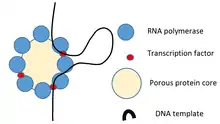A generic transcription factory during transcription, highlighting the possibility of transcribing more than one gene at a time. The diagram includes 8 RNA polymerases however the number can vary depending on cell type. The image also includes transcription factors and a porous, protein core.