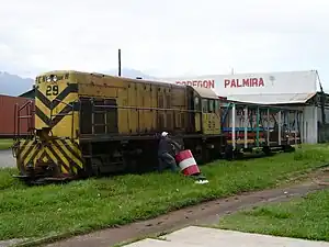 Passenger train in La Ceiba on January 11, 2005. Engineer tanks fuel manually from a barrel. Colorful passenger car (former box car without walls) is attached to the right.