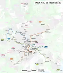 Montpellier has 4 tram routes, serving large parts of the city. The first line opened in 2000 and there is now a network of 63 km (2012). All 4 routes serve Montpellier-Saint-Roch railway station.