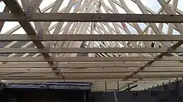 Wood is used in the construction of buildings, bridges, trackways, piles, poles for power lines, masts for boats, pit props, railway sleepers, fencing, hurdles, shuttering for concrete, pipes, scaffolding and pallets. In housebuilding it is used in joinery, for making joists, roof trusses, roofing shingles, thatching, staircases, doors, window frames, floor boards, parquet flooring, panelling and cladding.[127]