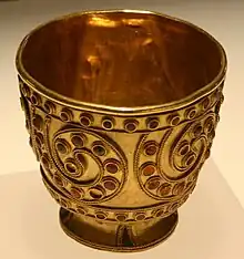 The Trialeti culture was known for its particular form of burial. The elite were interred in large, very rich burials under earth and stone mounds, which sometimes contained four-wheeled carts. Also there were many gold objects found in the graves.[13] These gold objects were similar to those found in Iran and Iraq.[9] They also worked tin and arsenic.[17] This form of burial in a tumulus or "kurgan", along with wheeled vehicles, is the same as that of the Kurgan culture which has been associated with the speakers of Proto-Indo-European. In fact, the black burnished pottery of especially early Trialeti kurgans is similar to Kura-Araxes pottery.[18] In a historical context, their impressive accumulation of wealth in burial kurgans, like that of other associated and nearby cultures with similar burial practices, is particularly noteworthy.[19] This practice was probably a result of influence from the older civilizations to the south in the Fertile Crescent.[20]