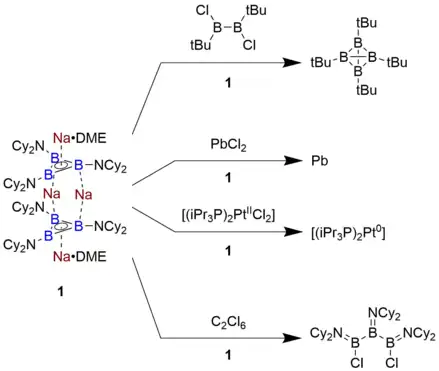 The reactivity of triboracyclopropenyl-containing compounds is relatively under-explored, as only one example has been prepared in the solution phase. The compound reported by Braunschweig, Na4[B3(NCy2)3]2 • 2 DME, is an extremely potent reductant with an oxidation potential of -2.42 V vs. the ferrocene/ferrocenium couple. As a result, it is capable of reducing chloroboranes to afford tetrahedral B clusters, along with reducing PbCl2 directly to metallic Pb. In addition, it will undergo a ring-opening reaction at the B3 moiety by abstracting chlorine atoms from hexachloroethane. This level of reducing power is roughly comparable to an alkali metal, and has not been previously observed for any molecule based on an organic framework.[7]