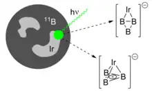 Negatively charged ions containing triboracyclopropenyl have proven amenable to study by photoelectron spectroscopy. By Koopman's theorem, neglecting the effects of strong electron correlation, the kinetic energies of electrons detached by X-rays can be mapped onto binding energies of individual orbitals and reveal the molecular electronic structure.[26][27] Splitting of the resulting spectral peaks from "vibrational progression" (according to the Franck-Condon principle) indicates how ionization at different energies changes specific vibrational frequencies of the molecule, and such effects on bonding are interpreted in terms of changes to the electron configuration. In B3−, an unusually high-intensity and high energy band corresponding to a multielectron or "shake-up" transition (coupled electron detachment and electronic excitation) was observed, suggesting the strong electron correlation present in the triboracyclopropenyl fragment.[4] For IrB3−, vibrational progression from the stretching and breathing vibrations of IrB3 could be assigned in the overlaid spectra of both isomers present in the cluster beam. By comparison to computations, the minimum energy structure of IrB3 could then be formulated as a tetrahedron with an intact, aromatic B3+ moiety.[8]