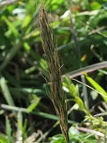The inflorescence is an open or compact panicle of green, tan, or purplish spikelets up to 20 centimeters long.