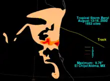 The tropical depression traveled to the northwest across the southwest Gulf of Mexico.[1] It strengthened rapidly, and there was evidence of deep convection as it passed over warm waters.[3] It was upgraded to Tropical Storm Beryl late on August 14 with surface winds of 50 mph (80 km/h), based on reconnaissance aircraft observation.[1] Six hours later, the storm accelerated to near 9 mph (14 km/h), meaning that landfall would happen sooner than expected, preventing the time for Beryl to strengthen to a hurricane.[4] However, Beryl failed to undergo significant intensification as was forecast, as it maintained an intensity of 50 mph (80 km/h). The lack of intensification could be due to moderate wind shear and entrainment over the Gulf of Mexico. Tropical Storm Beryl continued to track to the northwest toward the Rio Grande Valley area in the southern portion of the U.S. state of Texas. The storm made landfall early on August 15 along the Mexican coast about 105 mi (169 km) south of Brownsville, Texas, 35 mi (56 km) north La Pesca, Tamaulipas[1] and about 115 mi (185 km) north of Tampico. Beryl was downgraded to a tropical depression about five hours after landfall.[1] The Brownsville radar showed that the circulation center of the storm became elongated parallel to the mountain ranges of northeastern Mexico, so the system was no longer declared a tropical depression late on August 15,[5] while located near Monterrey.[1]