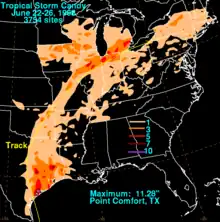 Outside of Texas, 2 to 4 inches (51 to 102 mm) of rain was reported in eastern Oklahoma, northwestern Arkansas, central Missouri, and northern Illinois.[4] Precipitation in Michigan exceeded 6 inches (150 mm) in some areas,[6] contributing to the ongoing flooding event in Ann Arbor.[7] Flash flooding was reported in western New York, due to precipitation amounts up to 3.04 inches (77 mm) in Buffalo during a 24–hour period. As a result, streams overflowed their banks, inundating many basements, sewers, and underpasses.[8] While tropical, Candy spawned 19 tornadoes or funnel-clouds to form between June 23 and 25. Ten were reported in Texas, five in Arkansas, three in Louisiana, and one in Missouri. Five additional tornadoes, which were associated with the extratropical remnants of Candy, were reported on June 25 in eastern Ohio. Despite the amount of tornadoes, only one caused significant damage. That tornado "nearly demolished" a school in Morning Star, Arkansas.[4] The total property damage from the storm was "conservatively" estimated at $1 million, while losses to agriculture in eastern Texas approached $2 million. No deaths were reported in relation to the storm. Candy made 1968 only one of five years to have three named storms in June, with the others being 1886, 1936, 1959, and 2023.[4]