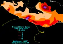 ![]() Tropical Storm Carlos near peak intensity on June 26 | |