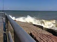 The strongest winds occurred in southern and coastal counties, with brief periods of sustained gales reported in Dauphin Island and Fort Morgan. A maximum gust of 49 mph (79 km/h) was measured in Point Clear.[62] Approximately 90,000 Alabama Power customers lost electricity due to downed power lines.[63] Storm surge accompanying the cyclone generally reached 1–3 ft (0.3–0.9 m), with a maxima of 3.67 ft (1.12 m) in Bayou La Batre. Surf heights on top of the surge in Mobile Bay reached 6–12 ft (1.8–3.7 m). Flooding forced the closure of roads in Bayou La Batre, Coden, and The Causeway along U.S. Route 90.[62] The Dauphin Island fishing pier sustained minor damage.[64] Three tornadoes touched down in the state: two were rated EF0 while the other was rated EF2. The former two caused minimal damage near Florala and the Cedar Point Pier in Mobile where one person was injured by debris.[62] The latter of these caused extensive damage along a 22 mi (35 km) path from East Brewton to Castleberry.[65] The tornado damaged or destroyed about 70 buildings and injured 20 people;[63] 2 people sustained serious injuries, one of whom was thrown from his home when it was destroyed.[65]