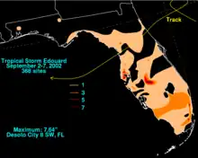 Tropical Storm Edouard was the first of eight named storms to form in September 2002, the most such storms in the North Atlantic for any month at the time.[1] The fifth tropical storm of the 2002 Atlantic hurricane season, Edouard developed into a tropical cyclone on September 1 from an area of atmospheric convection associated with a cold front east of Florida. Under weak steering currents, Edouard drifted to the north and executed a clockwise loop to the west. Despite moderate to strong levels of wind shear, the storm reached a peak intensity of 65 mph (105 km/h) on September 3, but quickly weakened as it tracked westward. Edouard made landfall on northeastern Florida on September 5, and after crossing the state it dissipated on September 6 while becoming absorbed into the larger circulation of Tropical Storm Fay.[2]