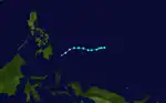 A tropical depression formed east of the Philippines on August 25, drifting northward before generally moving west. The system peaked as a tropical storm with winds of 75 km/h (45 mph) on the that same day. Kate gradually weakened throughout its lifespan after its peak as it recurved northeastward, degrading to a tropical depression on August 26, before dissipating by August 27.[30]