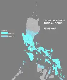 Upon the system's formation, the PAGASA issued a public storm warning signal No. 1 at 2100 UTC on June 27 for the entirety of Samar, as well as the Dinagat Islands and Siargao Island.[4] At 0900 UTC the following day, the warnings in Visayas were extended to include the provinces of Leyte and Biliran. The warnings were also expanded to include numerous provinces in Luzon.[21] Later that day, all preexisting warnings in Visayas and Mindanao were upgraded to signal No. 2 classification, while other areas of Visayas were issued new signal No. 1 warnings. In Luzon, the provinces of Catanduanes, Albay, Sorsogon, Masbate, Burias Island, and Ticao Island were upgraded to No. 2 warnings, while the provinces of Quezon, Polillo Island, Camarines Norte, Camarines Sur, Marinduque, and Romblon remained under or were issued No. 1 warnings.[9] As Rumbia approached the coast, No. 1 warnings were expanded to include additional provinces, while No. 2 warnings generally covered the same areas up until landfall. All warnings in Mindanao were discontinued by 0300 UTC on June 29, by which time Rumbia made landfall.[12]