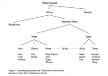 Tsʼixa is a critically endangered African language that belongs to the Kalahari Khoe branch of the Khoe-Kwadi language family.[2] The Tsʼixa speech community consists of approximately 200 speakers who live in Botswana on the eastern edge of the Okavango Delta, in the small village of Mababe.[2] They are a foraging society that consists of the ethnically diverse groups commonly subsumed under the names "San", "Bushmen" or "Basarwa".[2] The most common term of self-reference within the community is Xuukhoe or 'people left behind', a rather broad ethnonym roughly equaling San, which is also used by Khwe-speakers in Botswana.[2] Although the affiliation of Tsʼixa within the Khalari Khoe branch, as well as the genetic classification of the Khoisan languages in general, is still unclear, the Khoisan language scholar Tom Güldemann posits in a 2014 article the following genealogical relationships within Khoe-Kwadi, and argues for the status of Tsʼixa as a language in its own right.[3] The language tree to the right presents a possible classification of Tsʼixa within Khoe-Kwadi: