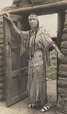 Tsianina Redfeather was born Florence Tsianina Evans at Eufaula, Muscogee Nation, in Indian Territory (now Oklahoma), to Muscogee parents. Her ancestors were forced from their homeland in the Southeast United States and forced to march on the trail of tears.[1] All nine of Tsianina's siblings had musical talent, but she was the best. She began training at the age of 14 in Denver, Colorado, sponsored in part by Alice Robertson.[2][3] She had earned scholarships in Denver and New York City. While training in Denver, Tsianina became a mezzo-soprano virtuoso and met Charles Cadman, an American pianist, who later became her partner in touring and performing across the globe.[3]