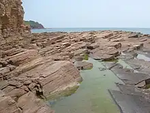 The island has the shape of a kidney bean with its concave side facing northeast. Its name "Ping Chau" means "flat island" in Chinese.[4] The highest points on the island are 48 metres (157 feet) in the south and 37 metres (121 feet) in the north. The eastern inner shore of the crescent hugs Ping Chau Hoi (平洲海) with a few beaches, including Cheung Sha Wan (長沙灣) in the northeast. In contrast, the western coast of the island is fairly rocky as a result of the greater wave action taking its toll on the inclined siltstone there.