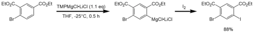 In contrast to Turbo-Grignard compounds that are used for highly efficient Br/Mg exchange reactions,[13] Turbo-Hauser bases are used as effective deprotonation reagents of functionalized aromatics.[1] After deprotonation, the intermediate product (a Turbo-Grignard) can selectively be functionalized via addition of an electrophile (e.g. I2, -CHO).