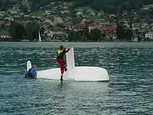 In yacht sailing, multihulls are deemed to be more prone to turtling than keeled monohulls, and there is essentially no way to right them if they overturn. The juxtaposition of the hulls and sail when turtled—it makes them inherently stable when inverted—makes them especially resistant to righting.[6][23] Consequently, some larger multihulls are built with a turtle emergency escape hatch beneath the hull. Indeed, some locales require such safety hatches.[28] There are, however, those who feel that the likelihood of a capsize of a large multihull is overrated.[29][30] There are others who state that a self-righting multihull is the answer, along with designing in safety and proper operation.[28] A patent has been issued specifically concerning righting of turtled large multihulls.[31] It is intended to avoid the necessity to use divers and special equipment in a recovery.[31]