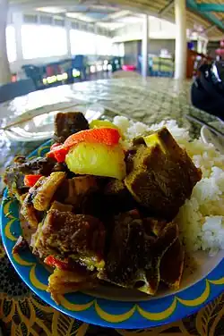 The traditional foods eaten in Tuvalu are pulaka,[1] which is a "swamp crop" similar to taro,[2] but "with bigger leaves and larger, coarser roots",[3] bananas, breadfruit and coconut.[4] Tuvaluans also eat seafood, including coconut crab, fish from the lagoon and ocean, seabirds (taketake or black noddy and akiaki or white tern) and also pork.[5]