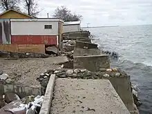 Twin Lakes Beach has been the recipient of many storms causing shoreline erosion, flooding and property damage. Most notably are the storms of the fall of 1999, especially the storm on November 1 , as well as the fall of 2010 "weather bomb" both of which involved wind gusts of over 100 km/h and high winds for an extended period of time with the result being a shift in the lake of water from the north basin of Lake Manitoba to the south basin of the lake and large waves. Both storms resulted in considerable shoreline erosion, property damage, and some flooding. The 1999 storm caused an estimated $1 million in damage and was a catalyst for establishing new regulation of lake levels.[5] Also in 1981 and 1992 cottages were destroyed as a result of shoreline ice pile-up. On July 29, 2012 a thunderstorm occurred at Twin Lakes Beach causing widespread damage to property including complete destruction of homes due to heavy rain, hail, and plow winds with gusts up to 150 km/h recorded on radar.[16][17]