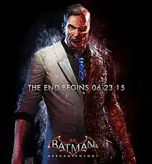 • Two-Face appears in Batman: Arkham Knight, in which he joins forces with Scarecrow and the eponymous Arkham Knight, among other supervillains, in an attempt to finally kill Batman. Using firearms supplied by the Penguin, Two-Face and his men oversee a string of bank heists in the side mission "Two-Faced Bandit", only to be defeated and sent to the GCPD lockup by Batman.[26] Furthermore, Two-Face appears in the "Robin: A Flip of a Coin" DLC.[27]
