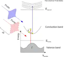 Time-resolved two-photon photoelectron (2PPE) spectroscopy is a time-resolved spectroscopy technique which is used to study electronic structure and electronic excitations at surfaces.[1][2] The technique utilizes femtosecond to picosecond laser pulses in order to first photoexcite an electron. After a time delay, the excited electron is photoemitted into a free electron state by a second pulse. The kinetic energy and the emission angle of the photoelectron are measured in an electron energy analyzer. To facilitate investigations on the population and relaxation pathways of the excitation, this measurement is performed at different time delays.