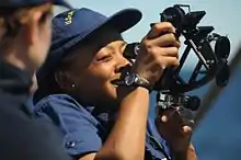 Eagle has a standing permanent crew of seven officers and 50 enlisted members; on training missions, she takes on a variety of temporary crew and sails with an average complement of 12 officers, 68 crew, and up to 150 trainees.[21] While on board, cadets and officer candidates receive a large amount of instruction from the crew. They take classes on numerous subjects that are key to life at sea, including navigation, seamanship, ship and boat maneuvering, line handling, sailing, first aid, weather patterns, damage control, engineering, career development, and more. They also stand watches in the engine room, on the bridge, on deck, in the scullery and galley, and during port calls, they assist the public by giving tours. The trainees are expected to qualify in a variety of watchstations applicable to their level of experience; for example, third class cadets complete their 'helm and lookout' qualification while upper-class cadets work to qualify in leadership positions on the bridge and in the engine room. At the same time, trainees are given a rigorous set of nautical tasks they must complete. One common training task involves the Eagle crew covering all Global Positioning System receivers on board and requiring trainees to navigate between ports using sextants, a compass, and the tools of celestial navigation.[22][23]