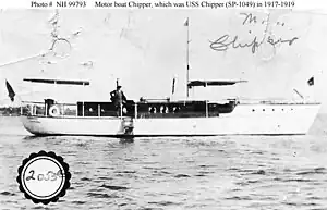 Chipper was built as a civilian motorboat of the same name in 1909 at Morris Heights in the Bronx, New York. The U.S. Navy leased her on 21 July 1917 for World War I service as a patrol vessel. She was commissioned as USS Chipper (SP-1049) on 24 July 1917.