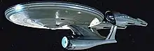 During a visit with Jefferies, Roddenberry and NBC staff were drawn to a sketch of the ship resembling its final configuration.[15] Jefferies had created a small model of this design that, when held from a string, hung upside-down – an appearance he had to "unsell".[15] He kept the hull smooth, with a sense that the ship's components were serviced from inside.[16] He designed the Klingon starship seen in the third season by rearranging and changing the shape of Enterprise's basic modules: a main body, two engine pods, and a neck with a head on it.[17] Some of Jefferies' rejected design concepts – such as spherical hull sections and warp engines that encircle a ship – inspired future Star Trek vessel designs.[18] Jefferies designed the hull to be smooth, concluding that the ship's important machinery would be inside the hull.[19]