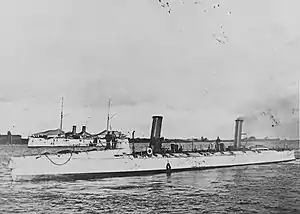![]() USS Ericsson (TB-2), photographed circa 1897-98, with either USS Cincinnati or USS Raleigh in the left background. | |