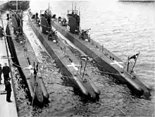 For surface running, they were powered by two New London Ship & Engine Co. 475-brake-horsepower (354 kW) diesel engines, each driving one propeller shaft. When submerged each propeller was driven by a 170-horsepower (127 kW) Electro Dynamic Co. electric motor. They could reach 14 knots (26 km/h; 16 mph) on the surface and 10.5 knots (19.4 km/h; 12.1 mph) underwater.[1] On the surface, the boats had a range of 2,300 nautical miles (4,300 km; 2,600 mi) at 11 knots (20 km/h; 13 mph) and 100 nmi (190 km; 120 mi) at 5 knots (9.3 km/h; 5.8 mph) submerged.[2]