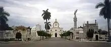 The first memorial to the Maine dead was constructed in the first six months of 1900.[92] Near the field of the Maine dead a concrete base was poured. Two Spanish mortars – taken by Admiral George Dewey from Cavite Arsenal in Manila, The Philippines, at the end of the Spanish–American War—were placed on brick piers on either side of this base.[93]