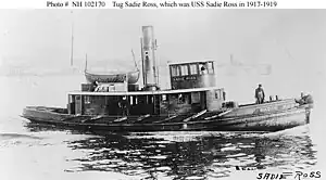 Sadie Ross was built in 1904 as a commercial tug of the same name by the Atlantic Works at East Boston, Massachusetts. On 17 May[3] or 2 June[4] 1917, the U.S. Navy acquired her from Rosstown Boat for use as a section patrol boat during World War I. She was commissioned as USS Sadie Ross (SP-736) on 7 June 1917.