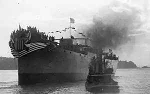 ![]() Willimantic being launched as a merchant cargo ship at the Todd Drydock and Construction Company at Seattle, Washington, on 29 May 1918 with her bow heavily decorated and the tug Prosper, of Seattle, standing by. | |