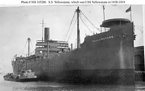 ![]() SS Yellowstone at Oakland, California, on 20 April 1918 during her builder's trials and before her commissioning as USS Yellowstone. | |