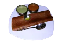 The ubiquitous Indian dish dosa has its origins in Udupi, according to P. Thankappan Nair.[3] Saaru, a spicy pepper water, is another essential part of the menu, and so are jackfruit, colocasia leaves, raw green bananas, mango pickle, red chillies, and salt. Adyes (dumplings), ajadinas (dry curries or stir fry curries), and chutneys, including one made of the skin of the ridge gourd, are specialities.[4]