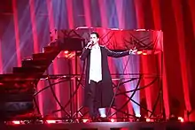 The Ukrainian performance featured Mélovin performing on stage in a black jacket and white shirt together with four backing vocalists.[10] The performance began with a two-level red lit-up piano being opened up with Mélovin, who was buried inside, lifted up by the contraption within the piano. During the second verse, Mélovin walked down the stairs to the centre stage where he took his jacket off and went back up to the top of the podium to play the piano while the stairs were set on fire at the end of the performance.[11] The stage directors and choreographers for the Ukrainian performance were Kostiantyn Tomilchenko and Oleksandr Bratkovskyi.[12] The four backing vocalists that joined Mélovin on stage were Dasha Ptashnik, Denis Nadyozhin, Konstantin Sologub and Luiza Kazaryan.[13]