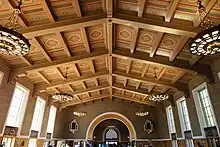 Enclosed garden patios are on either side of the waiting room, and passengers exiting the trains were originally directed through the southern garden. The lower parts of the interior walls are covered in travertine marble; the upper parts have an early form of acoustical tile. The floor in the large rooms is terra cotta with a central strip of inlaid marble (including travertine, somewhat unusual in floors since it is soft). The ceiling in the grand waiting room has the appearance of wood, but is actually made of steel.[28]