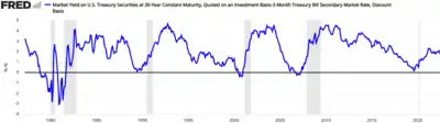 The U.S. federal government suspended issuing 30-year Treasury bonds for four years from February 18, 2002, to February 9, 2006.[13] As the U.S. government used budget surpluses to pay down federal debt in the late 1990s,[14] the 10-year Treasury note began to replace the 30-year Treasury bond as the general, most-followed metric of the U.S. bond market. However, because of demand from pension funds and large, long-term institutional investors, along with a need to diversify the Treasury's liabilities—and also because the flatter yield curve meant that the opportunity cost of selling long-dated debt had dropped—the 30-year Treasury bond was re-introduced in February 2006 and is now issued quarterly.[15] In 2019, Treasury Secretary Steven Mnuchin said that the Trump administration was considering issuance of 50-year and even 100-year Treasury bonds, a suggestion which did not materialize.[16]