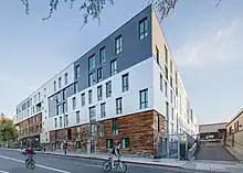 Jackson House, completed in 2002 at 2333 College Avenue contains apartments open to graduate students. It has a capacity of 120, in two-, three-, four-, five-, or six-bedroom apartments.[27] Both Jackson[28] and Channing-Bowditch[29] were designed by PYATOK, which also handled the renovation of Bowles Hall.[30]