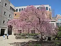 The Loyola Science Center contains 34 teaching and research laboratories, a rooftop greenhouse for teaching and research, a 180-seat lecture hall for symposia and seminars, numerous group study and research areas, 22 classrooms, 80 offices, a multi-story atrium, and a vivarium.[66] Additionally, the second floor of the Harper-McGinnis wing contains an area which highlights student, faculty, and community work and engages visitors.[67] It contains a large television which displays the University Twitter feeds, the science center's energy usage, and videos featuring student and faculty research; glass exhibits which feature research projects and science displays; and aquariums which house fish for student study from a variety of different ecosystems.[67] The Loyola Science Center also contains Bleeker Street, a coffee shop and cafe. The center was designed to meet the Silver standard for Leadership in Energy and Environmental Design (LEED) certification, though it has not gone through the certification process.[68]